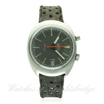 A RARE GENTLEMAN'S STAINLESS STEEL OMEGA GENEVE DRIVERS CHRONOSTOP WRIST WATCH CIRCA 1969, REF. 146.009/010 D: Grey off set dial with silver batons, "checkered flag" tracking, date aperture. M: 17 jewel manual wind movement signed Omega & numbered, calibre 920. C: Tonneau shaped case, signed Omega Watch Co, Omega crown & pusher, case width measures approx. 35mm. S: Original black leather racing style strap with Omega folding clasp. CONDITION REPORT D: Original dial in excellent condition. M: Working at present. C: In very good condition, some light scratches and wear due to general use. S: Poor condition. D: Dial / M: Movement / C: Case / S: Strap / B: Bracelet.