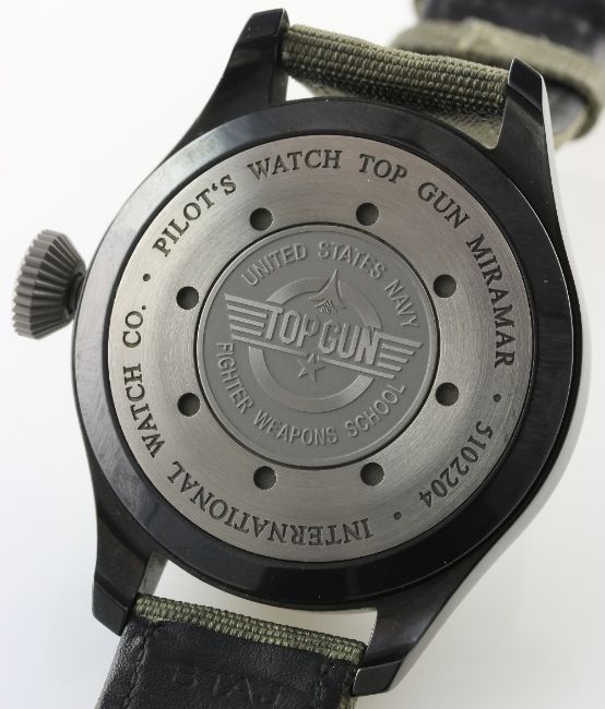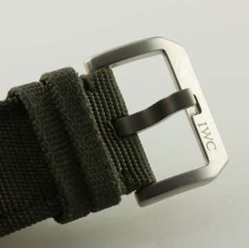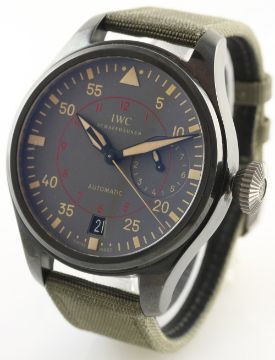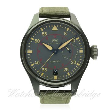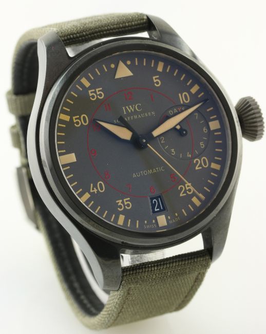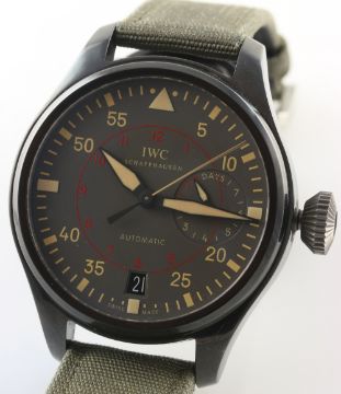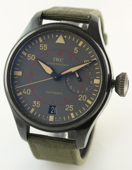 A GENTLEMAN'S CERAMIC IWC BIG PILOT TOP GUN MIRAMAR AUTOMATIC WRIST WATCH CIRCA 2012. REF. 501902 D: Grey dial with beige chapter ring & luminous markers, power reserve indicator, date aperture. M: Automatic movement with 7 day power reserve, signed IWC, calibre 51111. C: Military style case, signed & numbered with Top Gun United States Navy tribute, original crown, case diameter measures approx. 48mm. S: Original IWC textile strap & steel pin buckle. CONDITION REPORT D: Original dial in mint condition. M: Working at present. C: In excellent condition. S: In very good condition. D: Dial / M: Movement / C: Case / S: Strap / B: Bracelet