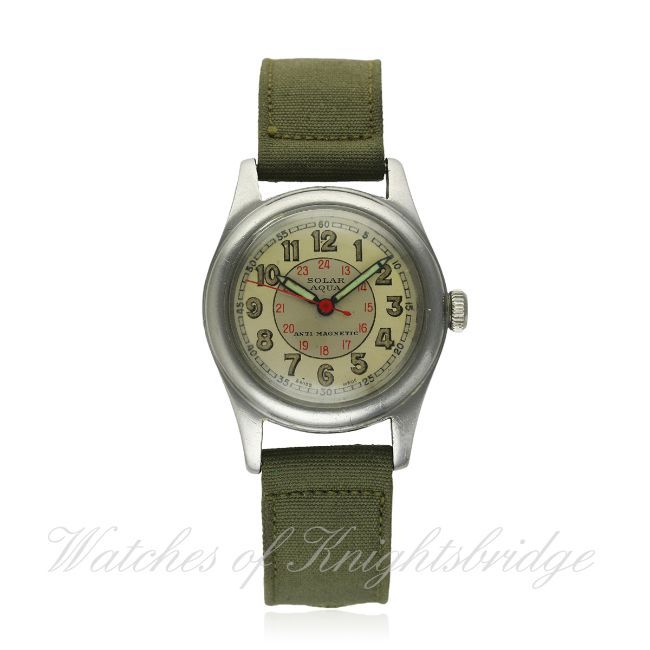 A GENTLEMAN'S STAINLESS STEEL ROLEX OYSTER SOLAR AQUA ANTI MAGNETIC WRIST WATCH CIRCA 1940s, REF. 2784 D: Two tone silver dial with luminous Arabic numerals, inner red 24 hour numerals, "pencil" hands. M: 17 jewel manual wind movement, signed Rolex Geneva under the dial on the top plate. C: Oyster case, signed Oyster Watch Co, R.W.C. Ltd, numbered, original Rolex Oyster crown, case diameter measures approx. 30mm. S: Textile strap. CONDITION REPORT D: Original dial in excellent condition. M: Working at present. C: In excellent unpolished condition. S: In very good condition. D: Dial / M: Movement / C: Case / S: Strap / B: Bracelet