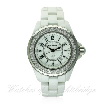 A LADIES MID SIZE WHITE CERAMIC & DIAMOND CHANEL J12 BRACELET WATCH DATED 2007, WITH BOX & PAPERS D: White dial with raised Arabic numerals, date aperture. M: Quartz movement signed Chanel. C: Circular case with original diamond set rotating bezel, signed Chanel & numbered, original crown, case diameter measures approx. 34mm. S: Original white ceramic Chanel bracelet. CONDITION REPORT D: Original dial in mint condition. M: Working at present. C: In excellent condition. S: In excellent condition. D: Dial / M: Movement / C: Case / S: Strap / B: Bracelet.
