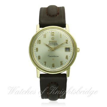 A GENTLEMAN'S STEEL & GOLD CAPPED OMEGA CONSTELLATION CHRONOMETER WRIST WATCH CIRCA 1967, REF. CD 168010 D: Silver dial with gilt faceted Arabic numerals, dauphine hands & date aperture. M: 24 jewel automatic movement, signed Omega Watch Co. & numbered, calibre 564. C: Circular case, signed Omega Watch Co., gilt Constellation badge on case back, Omega crown, case diameter measures approx. 35mm. S: Brown leather strap. CONDITION REPORT D: Dial in excellent condition. M: Working at present. C: In excellent condition, some light scratches and wear due to general use. S: New. D: Dial / M: Movement / C: Case / S: Strap / B: Bracelet.
