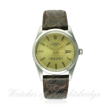 A GENTLEMAN'S STAINLESS STEEL ROLEX OYSTER PERPETUAL DATE WRIST WATCH CIRCA 1982, REF. 15000 D: Champagne dial with gilt batons & hands, date aperture. M: 27 jewel automatic chronometer movement with quick set date, signed Rolex S.A. & numbered, calibre 3035. C: Oyster case with "smooth" bezel, signed Montres Rolex S.A., numbered, Rolex crown, case diameter measures approx. 35mm. S: Brown leather strap. CONDITION REPORT D: Original dial in good condition, showing some small signs of age. M: Working at present. C: In excellent condition. S: New. D: Dial / M: Movement / C: Case / S: Strap / B: Bracelet