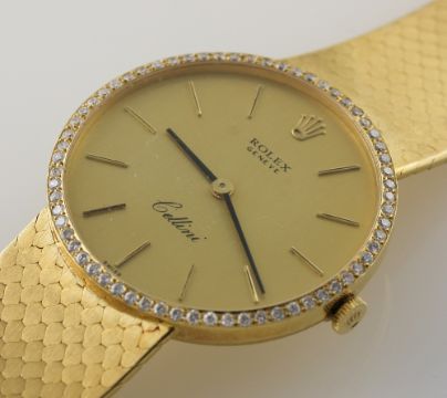 A GENTLEMAN'S 18K SOLID GOLD ROLEX CELLINI BRACELET WATCH CIRCA 1970s, REF. 4309 D: Champagne dial with gilt batons. M: 19 jewel manual wind movement, signed Rolex Geneve, calibre 1601. C: Circular case with diamond set bezel, signed Montres Rolex S.A., hallmarked & numbered, Rolex crown, case diameter measures approx. 32mm. B: Original 18k solid gold integral bracelet, total length measures approx. 195mm. CONDITION REPORT D: Dial in excellent condition. M: Working at present. C: In excellent condition, with some light scratches due to general use. B: In excellent condition. D: Dial / M: Movement / C: Case / S: Strap / B: Bracelet