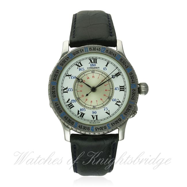 A GENTLEMAN'S STAINLESS STEEL LONGINES LINDBERGH HOUR ANGLE WRIST WATCH CIRCA 1990s, REF. 989.5215 D: White outer dial with applied Roman numerals to simultaneously show time & longitude, silver inner rotating dial is for synchronising with the radio time signal. M: 25 jewel automatic movement signed Longines & numbered, calibre L989.2. C: Circular case with a rotating bezel to correct the equation of time, signed Longines & numbered, original crown, case diameter measures approx. 37mm. S: Black leather Longines strap & pin buckle. CONDITION REPORT D: Original dial in excellent condition. M: Working at present. C: In excellent condition, some light surface scratches. S: In very good condition. D: Dial / M: Movement / C: Case / S: Strap / B: Bracelet