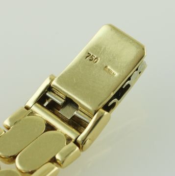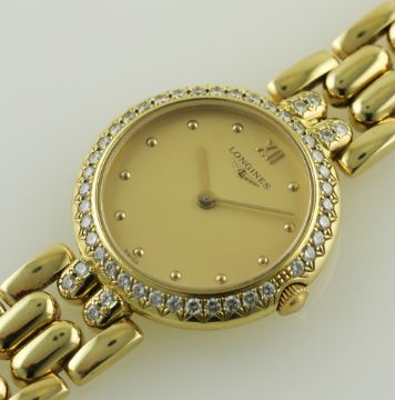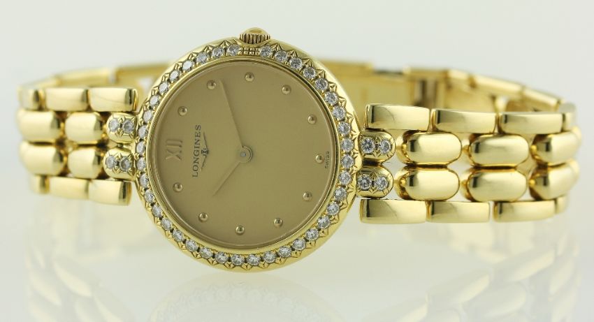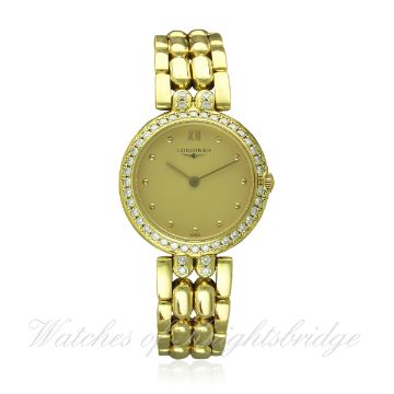 A LADIES 18K SOLID GOLD & DIAMOND LONGINES BRACELET WATCH CIRCA 1990s, L5.140.6 D: Champagne dial with gilt dot batons. M: Quartz movement signed Longines. C: Circular case with original diamond set bezel & lugs, signed Longines, hallmarked & numbered, case diameter measures approx. 24mm. B: Original Longines 18k solid gold bracelet, total length measures approx. 150mm. CONDITION REPORT D: Original dial in excellent condition. M: Working at present. C: In excellent condition, with some light scratches sue to general use. B: In excellent condition. D: Dial / M: Movement / C: Case / S: Strap / B: Bracelet