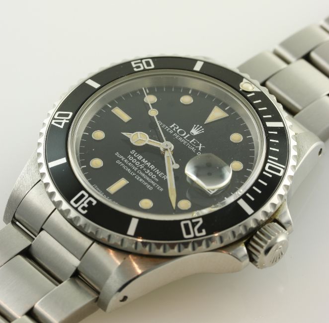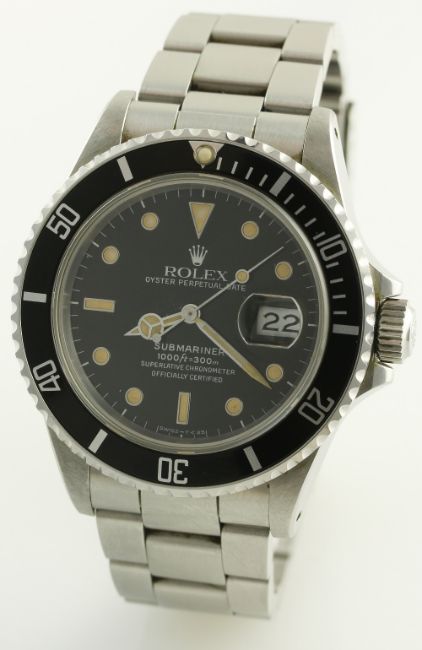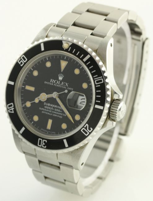 A RARE GENTLEMAN'S STAINLESS STEEL ROLEX OYSTER PERPETUAL SUBMARINER BRACELET WATCH DATED 1987, REF. 16800 'R' SERIAL NUMBER WITH ORIGINAL BOX, PAPERS AND BOOKLETS D: Black "star dust" dial with luminous inlaid silver markers, Mercedes hands, date aperture. M: 27 jewel automatic chronometer quick-set movement, signed Montres Rolex S.A. & numbered, calibre 3035. C: Oyster case with sapphire crystal, 60 minute rotating bezel, signed Montres Rolex S.A., numbered, Rolex triplock crown, case diameter measures approx. 40mm. B: Rolex Oyster Submariner bracelet, numbered L4/93150/593 CONDITION REPORT D: Original dial in excellent condition, with an even patina. M: Working at present. C: In excellent condition. B: In excellent condition. D: Dial / M: Movement / C: Case / S: Strap / B: Bracelet