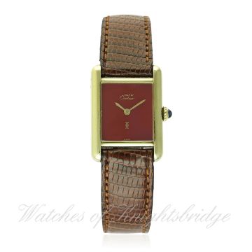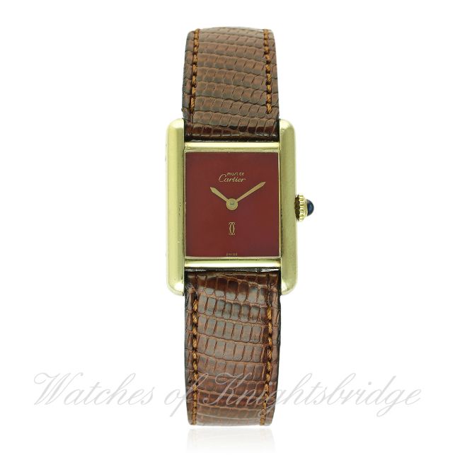 A LADIES SILVER GILT MUST DE CARTIER WRIST WATCH CIRCA 1990s D: Red lacquer dial with gilt hands. M: Manual wind movement signed Cartier. C: Classic Tank case, signed Cartier Paris, hallmarked & numbered, sapphire crown, case measures approx 28mm by 21mm. S: Must de Cartier leather strap & pin buckle. CONDITION REPORT D: Original dial in excellent condition. M: Working at present. C: In very good condition, with some light wear due to general use. S: In excellent condition. D: Dial / M: Movement / C: Case / S: Strap / B: Bracelet