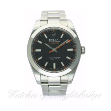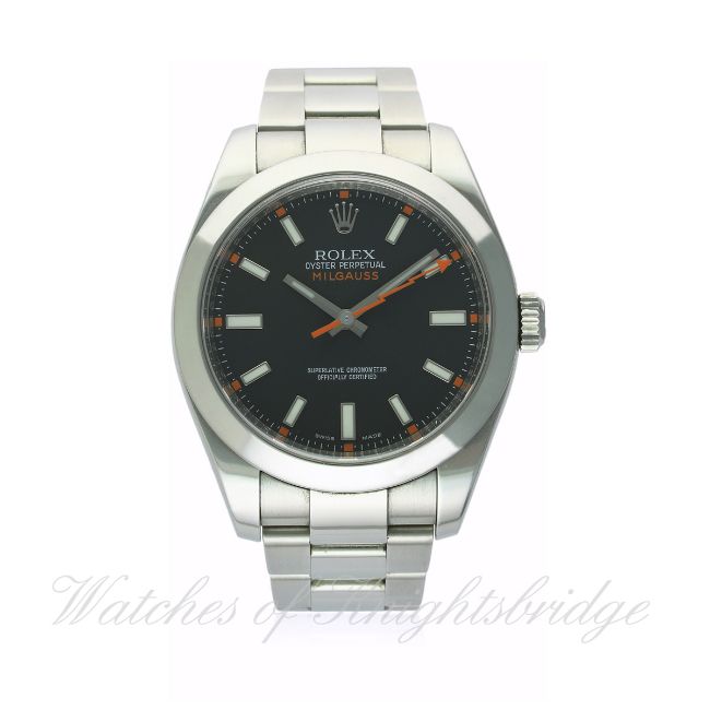 A GENTLEMAN'S STAINLESS STEEL ROLEX OYSTER PERPETUAL MILGAUSS BRACELET WATCH CIRCA 2009, REF. 116400 D: Black dial with luminous inlaid batons, outer orange markers & "lightning bolt" seconds hand. M: Automatic chronometer movement signed Rolex & numbered. C: Oyster case with sapphire crystal, signed, V serial no., original crown, case diameter measures approx. 40mm. B: Original Rolex Oyster bracelet. CONDITION REPORT D: Original dial in mint condition. M: Working at present. C: In excellent condition, with some scratches due to general use, sapphire crystal unmarked. B: In excellent condition with some light scratches. D: Dial / M: Movement / C: Case / S: Strap / B: Bracelet