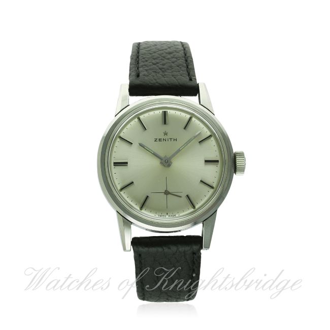 A RARE GENTLEMAN'S STAINLESS STEEL ZENITH 2000 WRIST WATCH DATED 1968 FROM CASE BACK INSCRIPTION D: Silver dial with black inlaid silver batons, subsidiary seconds. M: 19 jewel manual wind movement with swan neck regulator, signed Zenith & numbered, calibre 135. C: Circular screw back case, signed Zenith 2000 & numbered, Zenith crown, case diameter measures approx. 35mm. S: Black leather strap with Zenith pin buckle. CONDITION REPORT D: Original dial in excellent condition. M: Working at present. C: In excellent condition. S: In very good condition. D: Dial / M: Movement / C: Case / S: Strap / B: Bracelet