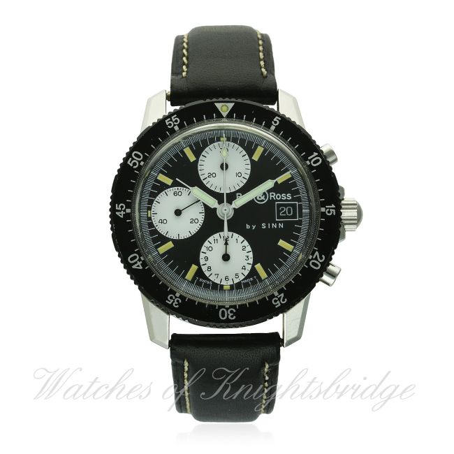 A RARE GENTLEMAN'S STAINLESS STEEL BELL & ROSS CHRONOGRAPH WRIST WATCH BY SINN CIRCA 1990s, REF. 103 D: Black dial with luminous markers, three white registers recording hours, minutes & continuous seconds, date aperture. M: 25 jewel automatic movement signed Sinn, Valjoux calibre 7750. C: Circular case with 60 minute rotating bezel, signed Sinn & numbered, original crown & pushers, case diameter measures approx. 41mm. S: Original Bell & Ross leather strap & pin buckle. CONDITION REPORT D: Original dial in excellent condition. M: Working at present. C: In excellent condition, with some light scratches due to general use. S: In very good condition. D: Dial / M: Movement / C: Case / S: Strap / B: Bracelet