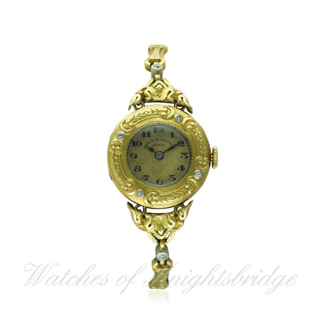 A RARE LADIES 18K SOLID GOLD & DIAMOND VACHERON & CONSTANTIN BRACELET WATCH 1920s D: Silver dial with Arabic numerals. M: Manual wind movement signed Vacheron & Constantin and numbered. C: Circular case with period engraved bezel set with 4 diamonds, swivel lugs, signed VC, hallmarked & numbered, case diameter measures approx. 25mm. B: Original 18k solid gold & diamond set bracelet, total length measures approx. 170mm. CONDITION REPORT D: Original dial in good condition with patina. M: Working at present. C: In excellent condition, with some light scratches due to occasional use, plexiglass has crazed. B: In excellent condition. D: Dial / M: Movement / C: Case / S: Strap / B: Bracelet