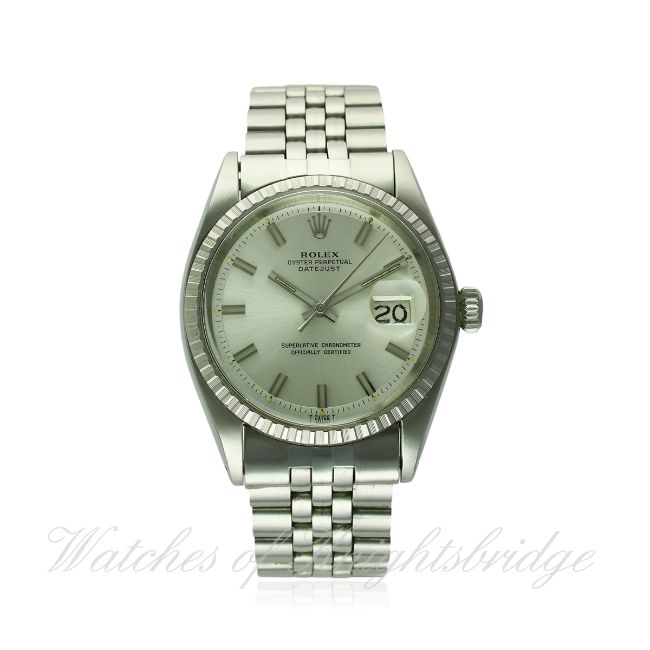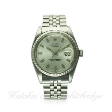 A RARE GENTLEMAN'S STAINLESS STEEL ROLEX OYSTER PERPETUAL DATEJUST BRACELET WATCH CIRCA 1971, REF. 1603 "WIDE BOY" D: Silver dial with wide silver batons & hands, date aperture. M: 26 jewel automatic chronometer movement, signed Montres Rolex S.A. & numbered, calibre 1570. C: Oyster case with milled bezel, signed Montres Rolex S.A., dated III.71, numbered, Rolex crown, case diameter measures approx. 36mm. B: Original Rolex Jubilee bracelet, signed Rolex U.S.A.. CONDITION REPORT D: Original dial in excellent condition. M: Working at present. C: In excellent condition, with some light scratches due to general use. B: In excellent condition. D: Dial / M: Movement / C: Case / S: Strap / B: Bracelet.