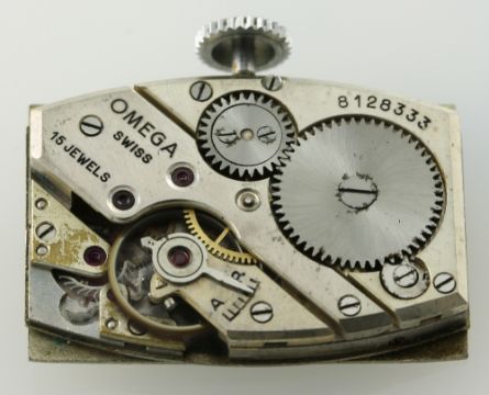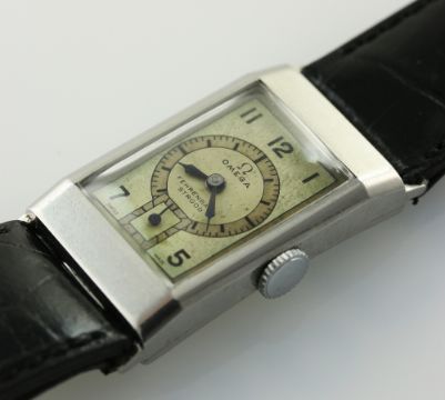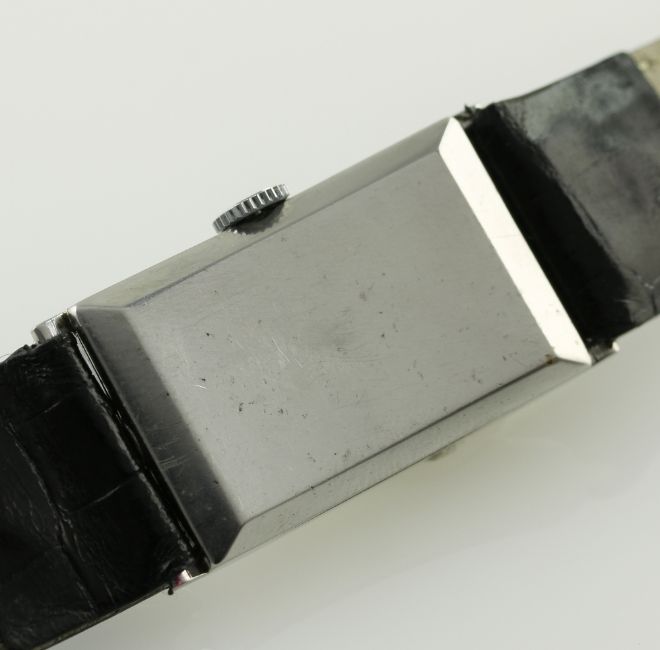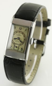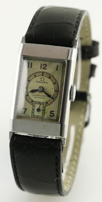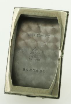 A GENTLEMAN'S STAINLESS STEEL RECTANGULAR OMEGA WRIST WATCH CIRCA 1935, REF. 8960455 RETAILED BY FEHRENBACH STROOD D: Silver two tone dial with applied Arabic numerals, subsidiary seconds. M: 15 jewel manual wind movement signed Omega & numbered. C: Rectangular case, signed Omega, case width measures approx. 20mm. S: Black leather strap. CONDITION REPORT D: Original dial in very good condition, showing some signs of age. M: Working at present. C: In excellent condition with some surface scratches due to general use. S: New D: Dial / M: Movement / C: Case / S: Strap / B: Bracelet.