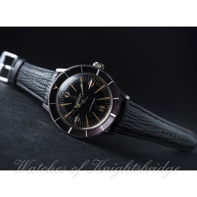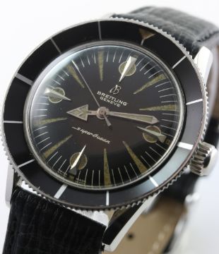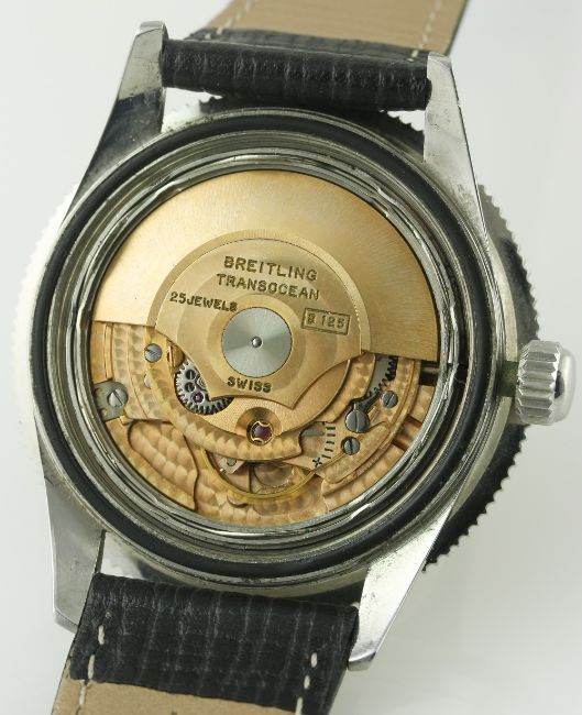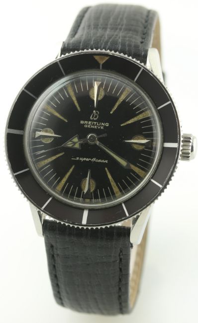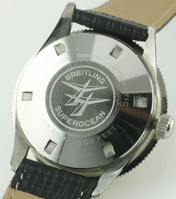 A RARE GENTLEMAN'S STAINLESS STEEL BREITLING SUPEROCEAN WRIST WATCH CIRCA 1960 D: Black dial with silver "dagger" batons & large luminous markers, steel hands with arrow hour pointer. M: 25 jewel automatic movement signed Breitling Superocean, calibre B 125. C: Circular case with rotating concave bezel, signed Breitling SuperOcean on case back with logo, case diameter measures approx. 39mm. S: Black leather strap. CONDITION REPORT D: Original dial in excellent condition, luminous is showing some age. M: Working at present. C: In excellent condition with some light scratches general use, bezel is in excellent condition. S: New. D: Dial / M: Movement / C: Case / S: Strap / B: Bracelet