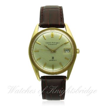 A GENTLEMAN'S 18K SOLID GOLD GIRARD PERREGAUX GYROMATIC WRIST WATCH CIRCA 1960s D: Silver dial with gilt batons & hands, date apeture. M: 39 jewel automatic movement. C: Circular screw back case, signed Girard Perregaux, hallmarked & numbered, GP crown, case diameter measures approx. 35mm. S: Brown leather strap. CONDITION REPORT D: Dial in very good condition. M: Working at present. C: In excellent condition with some light scratches due to general use. S: In fair condition. D: Dial / M: Movement / C: Case / S: Strap / B: Bracelet