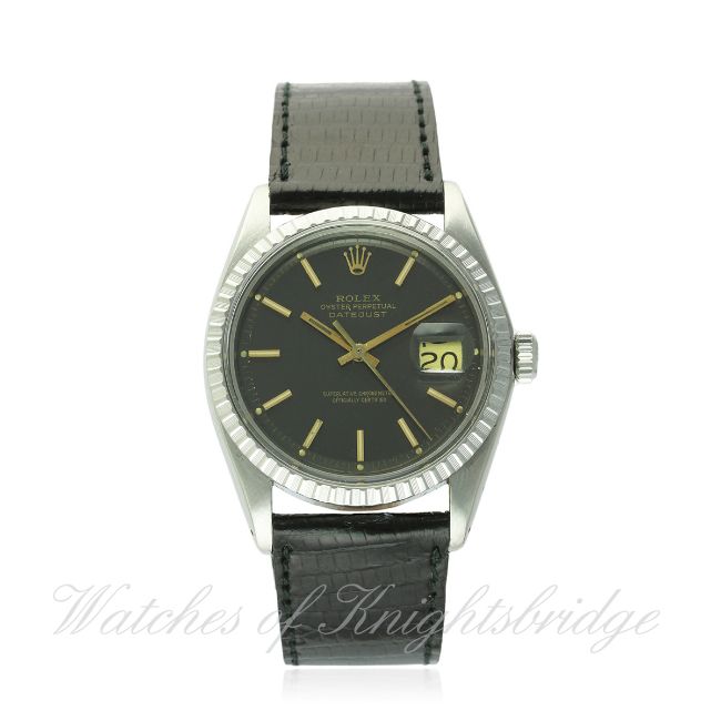 A GENTLEMAN'S STAINLESS STEEL ROLEX OYSTER PERPETUAL DATEJUST WRIST WATCH CIRCA 1977, REF. 1603 D: Rare charcoal coloured dial with gilt batons & hands, gilt font & tracking, date aperture. M: 26 jewel automatic chronometer movement, signed Montres Rolex S.A. & numbered, calibre 1570. C: Oyster case with milled bezel, signed Montres Rolex S.A., numbered, Rolex crown, case diameter measures approx. 36mm S: Black leather strap. CONDITION REPORT D: Original dial in excellent condition. M: Working at present. C: In excellent condition. S: New D: Dial / M: Movement / C: Case / S: Strap / B: Bracelet.