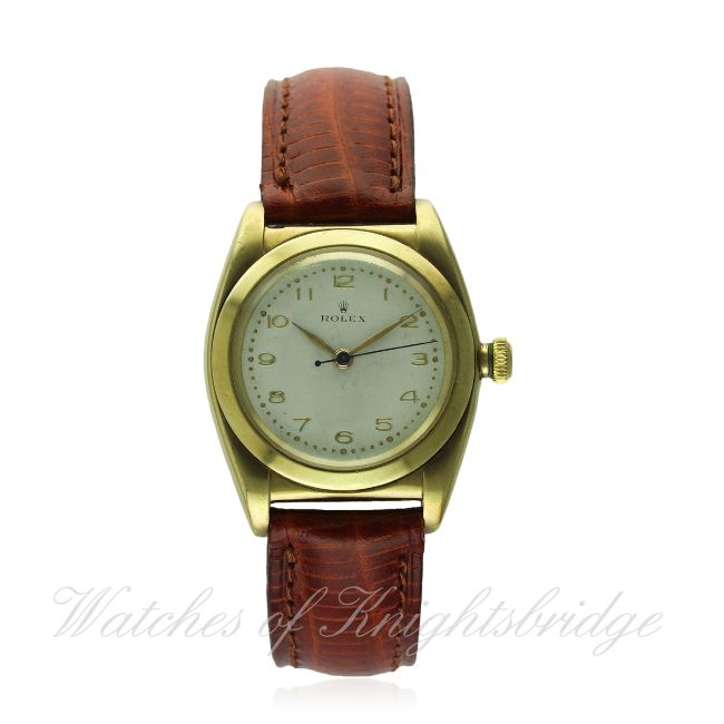 A GENTLEMAN'S 9CT SOLID GOLD ROLEX OYSTER PERPETUAL "BUBBLE BACK" CHRONOMETER WRIST WATCH CIRCA 1940s, REF. 3131 D: Silver dial with gilt Arabic numerals & dot tracking. M: Early automatic movement, signed Rolex Perpetual Chronometer & numbered. C: Oyster case, signed Rolex, hallmarked & numbered, original Rolex Oyster crown, case diameter measures approx. 32mm. S: Brown leather strap. CONDITION REPORT D: Dial in fair condition. M: Working at present. C: In very good condition, one small scuff near the lug and some light scratches to the plexiglass. S: New. D: Dial / M: Movement / C: Case / S: Strap / B: Bracelet