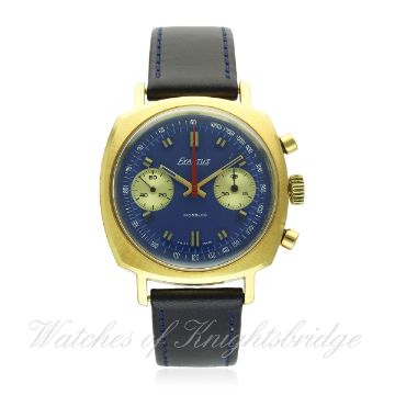 A GENTLEMAN'S GOLD PLATED EXACTUS CHRONOGRAPH WRIST WATCH CIRCA 1970, REF. 1008 D: Blue dial with gilt batons, outer tachymeter scale, two gilt registers recording minutes & continuous seconds. M: 17 jewel manual wind movement, Valjoux calibre 7733. C: Cushion shaped case, case width measures approx. 37mm. S: Blue leather strap. CONDITION REPORT D: Original dial in excellent condition. M: Working at present. C: In new old stock condition. S: New D: Dial / M: Movement / C: Case / S: Strap / B: Bracelet.