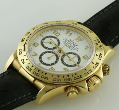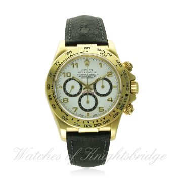 A GENTLEMAN'S 18K SOLID GOLD ROLEX OYSTER PERPETUAL COSMOGRAPH DAYTONA WRIST WATCH CIRCA 1991, REF. 16518 WITH ZENITH EL PRIMERO MOVEMENT D: White dial with black inlaid gold Arabic numerals, triple register with black rings recording hours, minutes & continuous seconds. M: 31 jewel automatic chronometer movement, signed Montres Rolex S.A. & numbered, Zenith El Primero base movement calibre 4030. C: Oyster case with units per hour bezel & partially hooded lugs, sapphire crystal, signed Montres Rolex S.A., N serial no., hallmarked, original Rolex screw down crown & pushers, case diameter measures approx. 39mm. S: Brown leather JPM leather strap with gold plated Rolex pin buckle. CONDITION REPORT D: Original dial in excellent condition. M: Working at present. C: In excellent condition, with some light scratches due to general use, small scuff on the edge of the sapphire crystal. N: New. D: Dial / M: Movement / C: Case / S: Strap / B: Bracelet