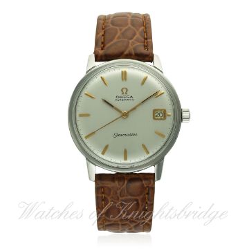 A GENTLEMAN'S STAINLESS STEEL OMEGA SEAMASTER AUTOMATIC WRIST WATCH CIRCA 1967, REF. 166.002 D: Silver dial with pink gold batons & hands, date aperture. M: 24 jewel automatic movement, signed Omega Watch Co. & numbered, calibre 562. C: Circular case, signed Omega Watch Co., Seamaster emblem embossed, Omega crown, case diameter measures approx. 35mm. S: Brown leather strap. CONDITION REPORT D: Original dial in excellent condition. M: Working at present. C: In excellent condition. S: New. D: Dial / M: Movement / C: Case / S: Strap / B: Bracelet