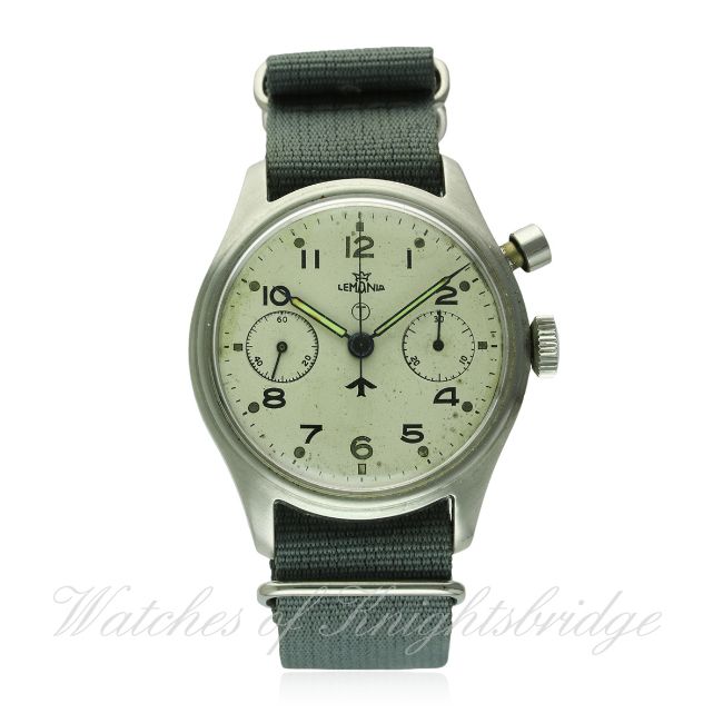 A GENTLEMAN'S STAINLESS STEEL BRITISH MILITARY ROYAL NAVY LEMANIA SINGLE BUTTON CHRONOGRAPH PILOTS WRIST WATCH CIRCA 1960s D: Silver dial with applied Arabic numerals & tritium luminous markers, military "fat" arrow, double register recording minutes & continuous seconds. M: 17 jewel manual wind movement numbered. C: Military case with fixed bars, issue markings ^ 0552/924-3305 1718 (H.S,^ 9 crossed out), case diameter measures approx. 39mm. S: Grey NATO strap. CONDITION REPORT D: Original M.O.D dial in very good condition, showing an even patina. M: Working at present. C: In very good condition. S:In excellent condition. D: Dial / M: Movement / C: Case / S: Strap / B: Bracelet.