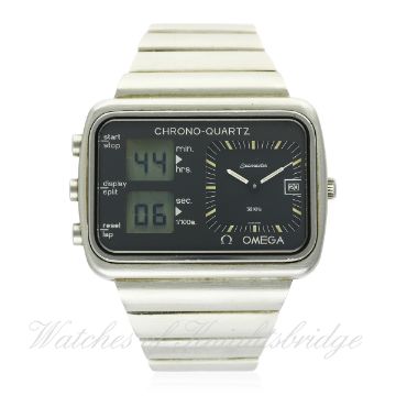 A GENTLEMAN'S STAINLESS STEEL OMEGA SEAMASTER CHRONO-QUARTZ "SCOREBOARD" BRACELET WATCH CIRCA 1976 MONTREAL OLYMPICS SPECIAL EDITION D: One analogue dial displaying time with date aperture, two LCD displays for chronograph function & continuous seconds. M: Quartz movement signed Omega & numbered, calibre 1611. C: Large "scoreboard" style case with Montreal Olympic & Seamaster emblems on case back, case width measures approx. 46mm. B: Original Omega bracelet. CONDITION REPORT D: Original dial in excellent condition. M: Working at present. C: In excellent condition, with some surface scratches due to general use. B: Also in excellent condition with some surface scratches due to general use. D: Dial / M: Movement / C: Case / S: Strap / B: Bracelet