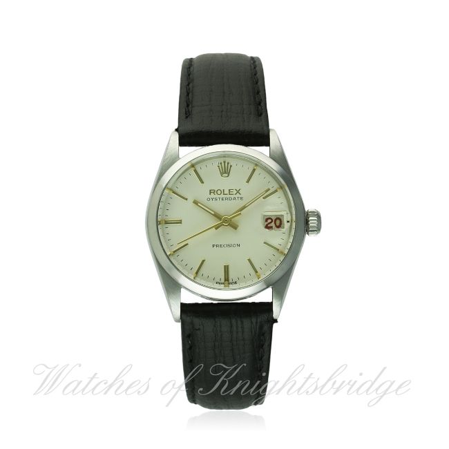 A MID SIZE STAINLESS STEEL ROLEX OYSTERDATE PRECISION WRIST WATCH CIRCA 1969, REF. 6466 WITH "ROULETTE" DATE D: Silver dial with gilt batons & hands, black & red date display. M: 17 jewel manual wind movement, signed Montres Rolex S.A. & numbered, calibre 1225. C: Oyster case, signed Montres Rolex S.A., dated II.69, numbered, Rolex crown, case diameter measures approx. 30mm. S: Black leather strap. CONDITION REPORT D: Dial in excellent condition. M: Working at present. C: In excellent condition. S: New. D: Dial / M: Movement / C: Case / S: Strap / B: Bracelet