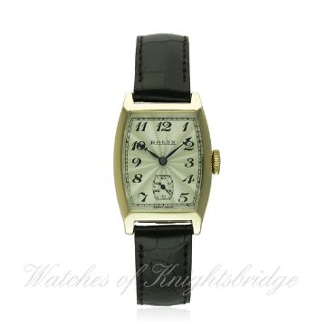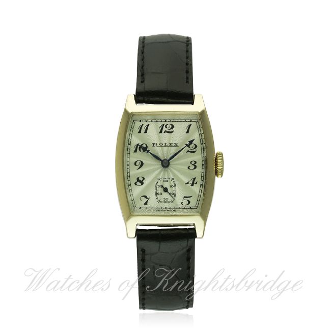A GENTLEMAN'S 9CT SOLID GOLD ROLEX TONNEAU WRIST WATCH CIRCA 1930s, REF. 578 D: Silver guilloche dial with Breguet style numerals, subsidiary seconds. M: 15 jewel manual wind movement, signed Rolex Timed 6 Positions For All Climates. C: Tonneau shaped case, signed Rolex 20 World's Records, hallmarked & numbered, case measures approx. 36mm/25mm. S: Black leather strap. CONDITION REPORT D: Dial in excellent condition. M: Working at present. C: In excellent condition. S: New. D: Dial / M: Movement / C: Case / S: Strap / B: Bracelet