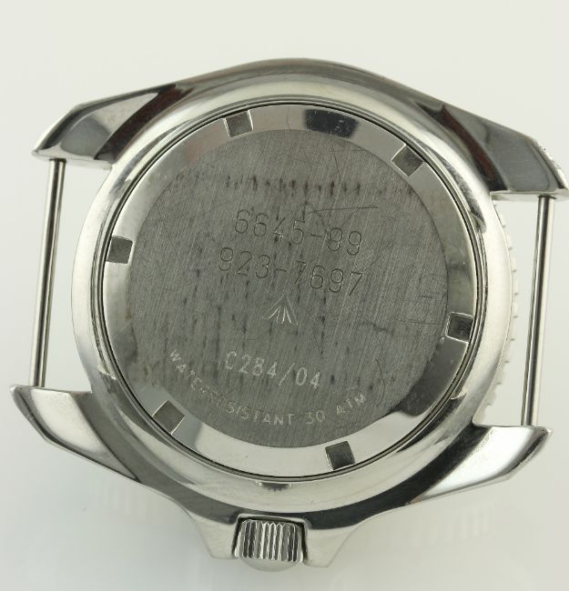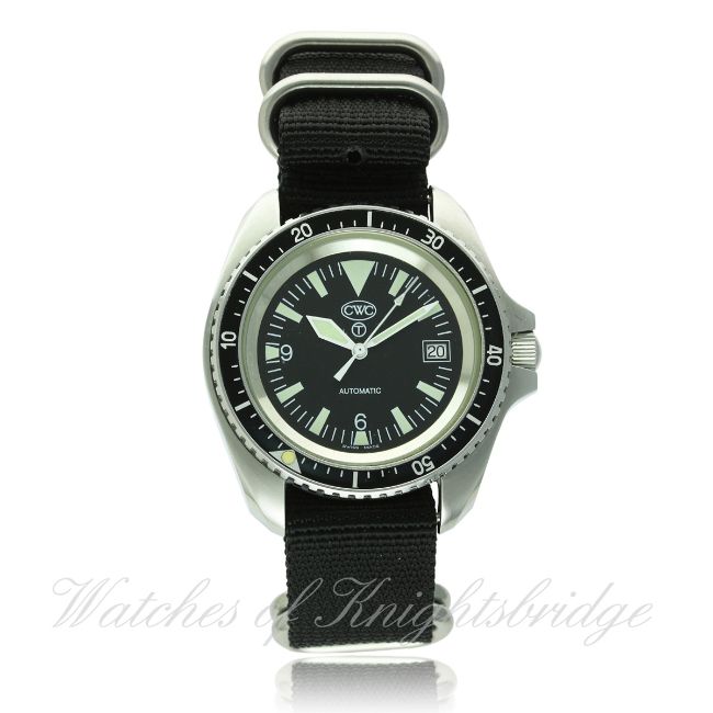 A GENTLEMAN'S STAINLESS STEEL BRITISH MILITARY CWC AUTOMATIC WRIST WATCH DATED 2009 WITH CWC WARRANTY CARD D: Black dial with Arabic numerals & tritium luminous markers, date aperture, "sword" hands. M: Automatic movement. C: Military case with fixed bars & 60 minute rotating bezel, issue markings 6645-99 923-7697 ^ C284/04, case diameter measures approx. 42mm. S: NATO strap. CONDITION REPORT D: Original dial in mint condition. M: Working at present. C: In excellent condition. S: In excellent condition. D: Dial / M: Movement / C: Case / S: Strap / B: Bracelet
