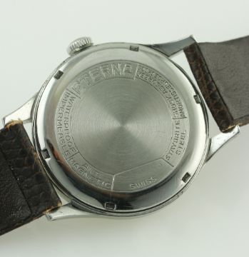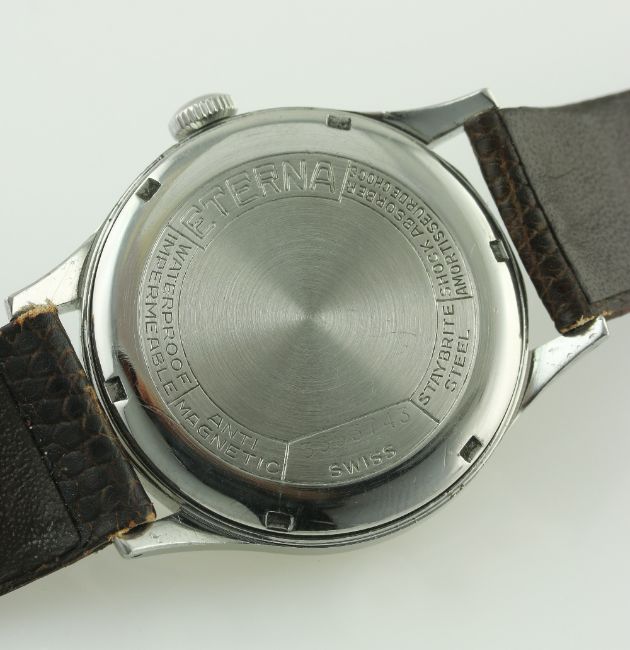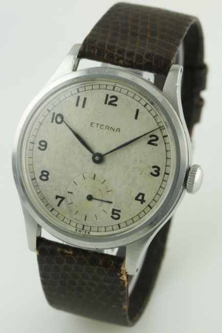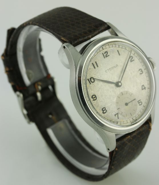 A GENTLEMAN'S STAINLESS STEEL ETERNA WRIST WATCH CIRCA 1940s D: Silver dial with Arabic numerals, subsidiary seconds. M: Manual wind movement, signed Eterna & numbered, calibre 852L. C: Large circular screw back case, signed Eterna & numbered, case diameter measures approx. 37mm. S: Brown leather strap. CONDITION REPORT D: Original dial in good condition, showing some signs of age. M: Working at present. C: In excellent condition with some light scratches due to general use. S: In fair condition. D: Dial / M: Movement / C: Case / S: Strap / B: Bracelet