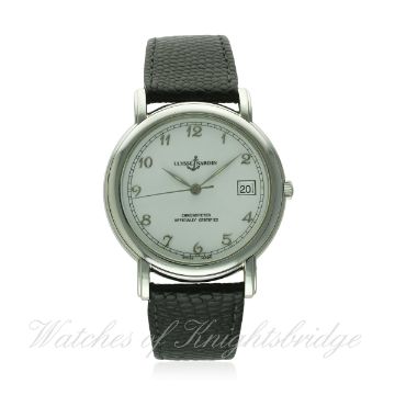 A GENTLEMAN'S STAINLESS STEEL ULYSSE NARDIN SAN MARCO AUTOMATIC CHRONOMETER WRIST WATCH CIRCA 2000, REF. 133-77 D: White dial with silver Breguet numerals, date aperture. M: Automatic movement signed Ulysse Nardin & numbered. C: Circular case, signed Ulysse Nardin & numbered, lion of San Marco embossed, original crown, case diameter measures approx. 37mm. S: Black leather strap with original Ulysse Nardin pin buckle. CONDITION REPORT D: Original dial in excellent condition. M: Working at present. C: In very good condition. S: In very good condition. D: Dial / M: Movement / C: Case / S: Strap / B: Bracelet