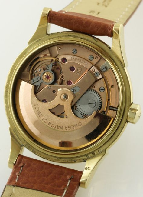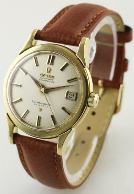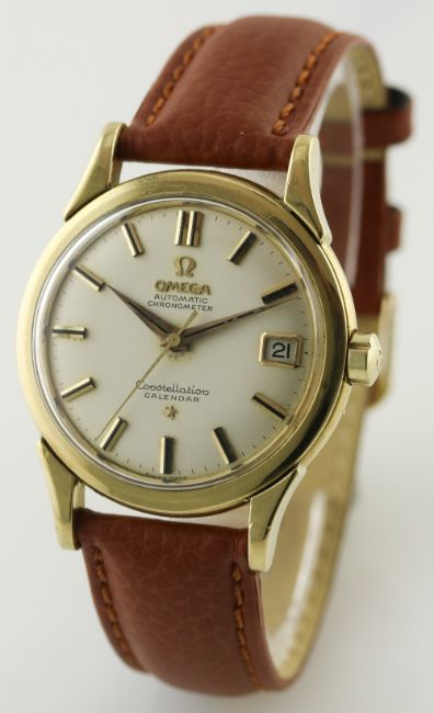 A RARE GENTLEMAN'S 18K SOLID GOLD OMEGA CONSTELLATION CALENDAR CHRONOMETER WRIST WATCH CIRCA 1960, REF. 972063 D: Silver dial with black inlaid gilt batons & dauphine hands, date aperture. M: 24 jewel automatic movement, signed Omega Watch Co. & numbered, calibre 561. C: Circular snap back waterproof case, signed Dennison Watch Case Co, Omega Watch Co, (Pat. Applied For), 18k hallmarks, Constellation badge embossed onto case back, Omega crown, case diameter measures approx. 35mm. S: Brown leather strap. CONDITION REPORT D: Original dial in excellent condition, with some small signs of age. M: Working at present. C: In excellent condition, with some light scratches due to general use. S: New. D: Dial / M: Movement / C: Case / S: Strap / B: Bracelet