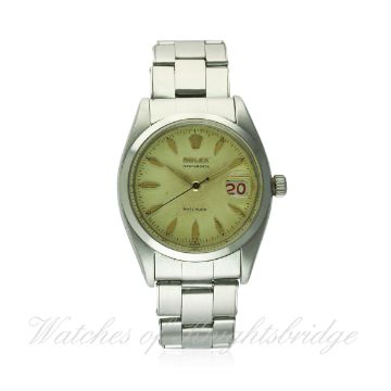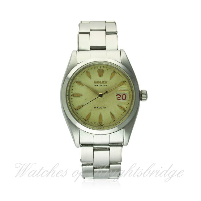 A GENTLEMAN'S STAINLESS STEEL ROLEX OYSTERDATE PRECISION BRACELET WATCH CIRCA 1956, REF. 6494 WITH "ROULETTE" DATE D: Silver dial with gilt faceted "dagger" batons & hands, black & red date display. M: 17 jewel manual wind movement, signed Montres Rolex S.A. & numbered, calibre 1210. C: Oyster case, signed Montres Rolex S.A., dated IV.56, numbered, Rolex crown, case diameter measures approx. 35mm. B: Rolex Oyster riveted bracelet, dated 2/64. CONDITION REPORT D: Original dial in very good condition, showing a patina & some small signs of age. M: Working at present. C: In excellent condition, with some light scratches due to general use. B: In very good condition. D: Dial / M: Movement / C: Case / S: Strap / B: Bracelet