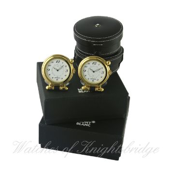 TWO GILT METAL MONTBLANC MEISTERSTUCK TRAVEL ALARM CLOCKS CIRCA 2012, REF.29313 IN UNUSED CONDITION WITH ORIGINAL BOX & OPEN PAPERWORK D: White dials with applied Roman numerals, inner minute track, rotating inner dial with "arrow head" pointer to set the alarm. M: Quartz movements. C: Circular case with hinged cover, signed MontBlanc & numbered, original crowns, case diameter measures approx 45mm CONDITION REPORT D: Original dials in mint condition. M: Working at present. C: In mint condition. D: Dial / M: Movement / C: Case / S: Strap / B: Bracelet