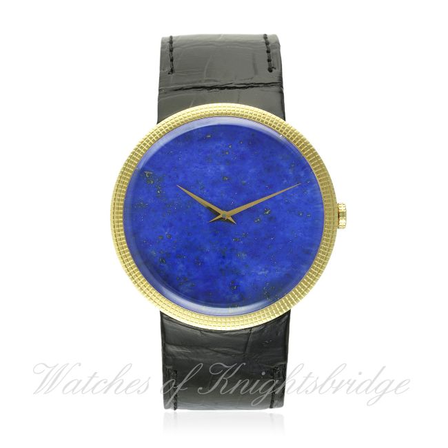 AN 18K SOLID GOLD CHRISITIAN DIOR LA D DE DIOR WRIST WATCH CIRCA 2014, REF. CD043152 SPECIAL LAPIS EDITION, UNWORN WITH BOX & PAPERS D: Lapis lazuli dial with gold hands. M: Quartz movement signed Dior. C: Large circular case, signed Dior, hallmarked & numbered, original crown, case diameter measures approx. 38mm. S: Original Dior leather strap & 18k solid deployment clasp. CONDITION REPORT D: Original dial in mint condition. M: Working at present. C: In mint condition. S: Unworn. D: Dial / M: Movement / C: Case / S: Strap / B: Bracelet