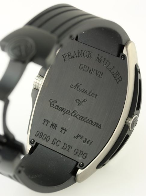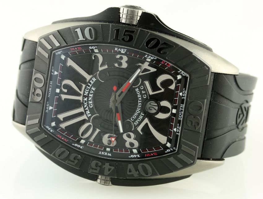 A RARE GENTLEMAN'S FRANCK MULLER CONQUISTADOR SPORT GPG TITANIUM WRIST WATCH CIRCA 2012, REF. 9900 SC DT GPG WITH ORIGINAL BOX D: Black 'Flamme' dial with applied graduated silver Arabic numerals, date aperture. M: Automatic movement with 42 hour power reserve, signed Franck Muller, platinum rotor, calibre FM 800 C: Tonneau shaped case, black titanium bezel with 60 minute markers, signed Franck Muller Geneve & numbered, original crown, case width measures approx. 48mm. S: Original Franck Muller black rubber strap & folding clasp. CONDITION REPORT D: Original dial in mint condition. M: Working at present. C: In excellent condition. S: In excellent condition, strap is slightly short. D: Dial / M: Movement / C: Case / S: Strap / B: Bracelet