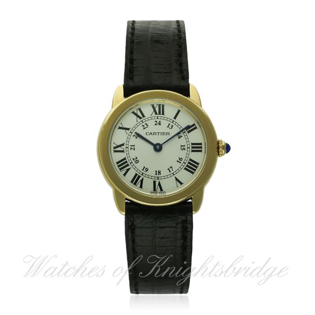 A LADIES 18K SOLID GOLD & STAINLESS STEEL CARTIER RONDE SOLO WRIST WATCH CIRCA 2013, REF. 2987 D: Silver dial with Roman numerals, inner 24 hour Arabic numerals & minute track, secret signature at X, blue steel hands. M: Quartz movement signed Cartier. C: Circular case, signed Cartier & numbered, original sapphire crown, case diameter measures approx 30mm. S: Original Cartier leather strap & 18k solid gold pin buckle. CONDITION REPORT D: Original dial in mint condition. M: Working at present. C: In excellent condition, with some light scratches due to general use. S: In excellent condition. D: Dial / M: Movement / C: Case / S: Strap / B: Bracelet