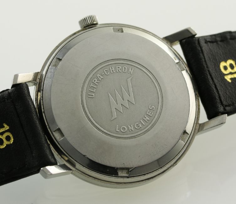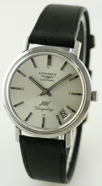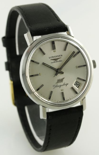 A GENTLEMAN'S STAINLESS STEEL LONGINES ULTRA CHRON AUTOMATIC FLAGSHIP WRIST WATCH CIRCA 1968, REF. 8056 2 D: Silver dial with black inlaid silver batons, date aperture. M: 17 jewel movement signed Longines, calibre 431. C: Circular case signed Longines & numbered, Ultra-Chron emblem embossed onto case back, Longines crown, case diameter measures approx. 34mm. S: Black leather strap. CONDITION REPORT D: Original dial in excellent condition. M: Working at present. C: In excellent condition,with some surface scratches. S: New. D: Dial / M: Movement / C: Case / S: Strap / B: Bracelet