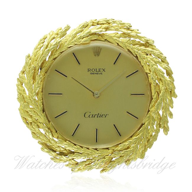 A RARE SOLID GOLD ROLEX BROACH WATCH CIRCA 1970 RETAILED BY CARTIER D: Champagne dial with black inlaid gilt batons. M: 17 jewel manual wind movement signed Montres Rolex S.A., calibre 1600. C: Circular 14k solid gold case signed Montres Rolex, two sets of numbers, hallmarks, surrounded by an 18k sold gold wreath design, hinged pin, total diameter approx 42mm. CONDITION REPORT D: Original dial in excellent condition. M: Working at present. C: In excellent condition, some light scratches due to general use. D: Dial / M: Movement / C: Case / S: Strap / B: Bracelet.