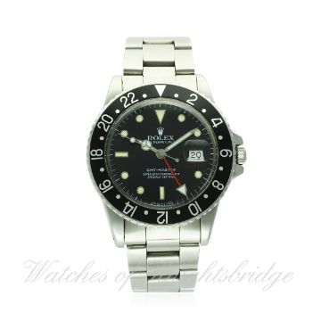 A GENTLEMAN'S STAINLESS STEEL ROLEX OYSTER PERPETUAL DATE GMT MASTER BRACELET WATCH CIRCA 1986, REF. 16750 "TRANSITIONAL" MODEL D: Gloss black dial with luminous inlaid white gold markers, Mercedes hands, dual time zone arrow hand, date aperture. M: 27 jewel automatic chronometer movement with quick set date, signed Rolex S.A. & numbered, calibre 3075. C: Oyster case with 24 hour rotating bezel, signed Montres Rolex S.A., numbered, Rolex crown, case diameter measures approx. 40mm. B: Rolex Oyster bracelet with flip lock clasp, numbered S DT9/93150/580. CONDITION REPORT D: Original dial in excellent condition, luminous showing a slight patina. M: Working at present. C: In very good condition, with some light scratches due to general use. B: In very good condition. D: Dial / M: Movement / C: Case / S: Strap / B: Bracelet