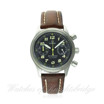 A GENTLEMAN'S STAINLESS STEEL OMEGA DYNAMIC AUTOMATIC CHRONOGRAPH WRIST WATCH CIRCA 1999, REF. 529050 WITH ORIGINAL TIN & PAPERS D: Black dial with applied luminous Arabic numerals, double register recording minutes & continuous seconds. M: 44 jewel automatic movement, signed Omega, calibre 1138. C: Circular case, signed Omega & numbered, Omega crown & pushers, case diameter measures approx. 38mm. S: Brown leather strap with Omega pin buckle. CONDITION REPORT D: Original dial in excellent condition. M: Working at present. C: In excellent condition. S: In very good condition. Watch box is showing its age. D: Dial / M: Movement / C: Case / S: Strap / B: Bracelet.