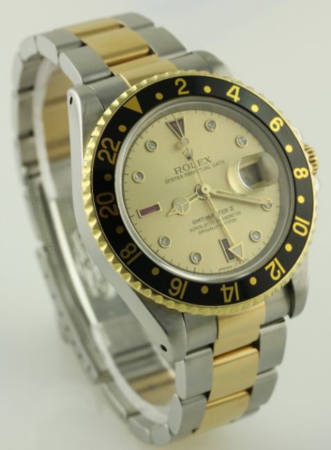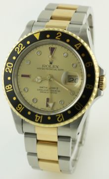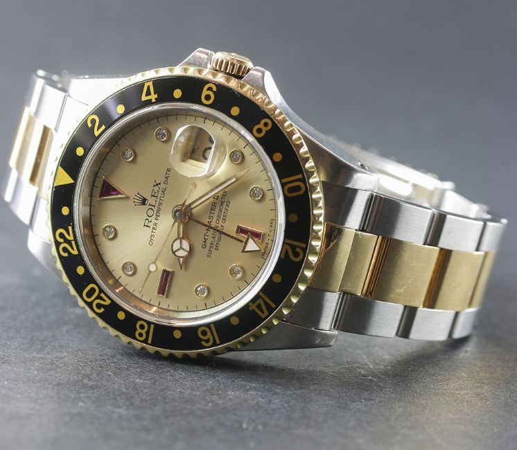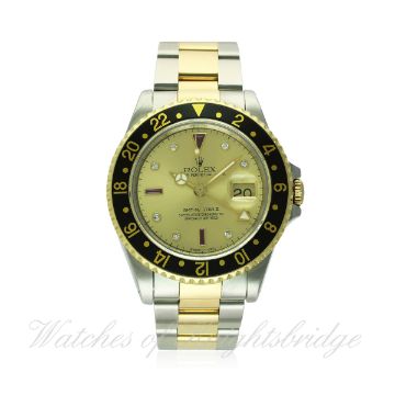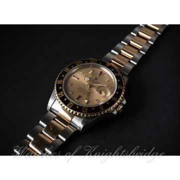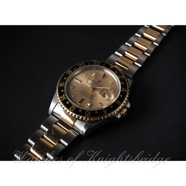 A RARE GENTLEMAN'S STEEL & GOLD ROLEX OYSTER PERPETUAL DATE GMT MASTER II BRACELET WATCH CIRCA 1991, REF. 16713 WITH "SERTI" DIAL D: Champagne dial with original diamond & ruby set markers, Mercedes hands, dual time zone arrow hand, date aperture. M: 31 jewel automatic chronometer movement with quick set date, signed Montres Rolex S.A. & numbered, calibre 3185. C: Oyster case with sapphire crystal, 18k solid gold rotating bezel with black 24 hour insert, signed Montres Rolex S.A., N serial no., gold Rolex crown, case diameter measures approx. 40mm. B: Original Rolex Oyster steel & 18k solid gold bracelet, numbered DE12/78363-18/458 B. CONDITION REPORT D: Original dial in very good condition, with some very light spotting. M: Working at present. C: In excellent condition, with some light scratches due to general use. B: In excellent condition. D: Dial / M: Movement / C: Case / S: Strap / B: Bracelet