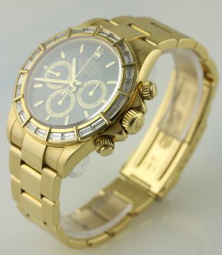 A GENTLEMAN'S 18K SOLID GOLD ROLEX OYSTER PERPETUAL COSMOGRAPH DAYTONA BRACELET WATCH CIRCA 1991, REF. 16528 WITH ZENITH EL PRIMERO MOVEMENT, WITH ROLEX BOX D: Black dial with luminous inlaid gold batons, triple register with gilt rings recording hours, minutes & continuous seconds. M: 31 jewel automatic chronometer movement, signed Montres Rolex S.A. & numbered, Zenith El Primero base movement calibre 4030. C: Oyster case with baguette diamond bezel, sapphire crystal, signed Montres Rolex S.A., X serial no., hallmarked, original Rolex screw down crown & pushers, case diameter measures approx. 39mm. B: Original 18k solid gold Rolex Oyster Daytona bracelet, numbered 78398. CONDITION REPORT D: Original dial in excellent condition. M: Working at present. C: In excellent condition, with some light scratches due to general use. B: In excellent condition. D: Dial / M: Movement / C: Case / S: Strap / B: Bracelet