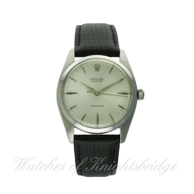 A RARE GENTLEMAN'S LARGE SIZE STAINLESS STEEL ROLEX OYSTER PRECISION WRIST WATCH CIRCA 1960, REF. 6424 D: Silver dial with silver "dagger" batons & hands. M: 17 jewel manual wind movement, signed Montres Rolex S.A. & numbered, calibre 1215. C: Oyster case, signed Montres Rolex S.A., numbered, Rolex crown, case diameter measures approx. 36mm. S: Brown leather strap. CONDITION REPORT D: Original dial in excellent condition. M: Working at present. C: In excellent condition, a few light scratches. S: New D: Dial / M: Movement / C: Case / S: Strap / B: Bracelet.