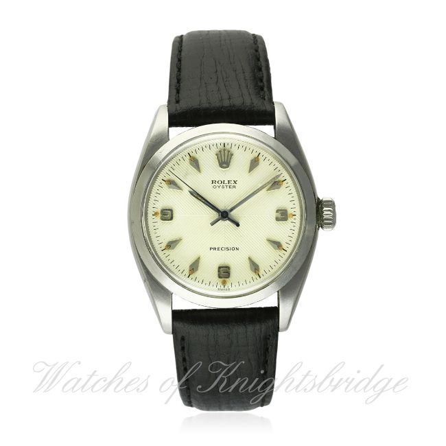 A RARE GENTLEMAN'S STAINLESS STEEL ROLEX OYSTER PRECISION WRIST WATCH CIRCA 1957, REF. 6422 D: Silver quartered dial with 3-6-9 Arabic numerals & arrow head batons. M: 17 jewel manual wind movement, signed Montres Rolex S.A., calibre 1215. C: Oyster case, signed Montres Rolex S.A., dated II.57, numbered, Rolex crown, case diameter measures approx. 35mm. S: Black leather strap. CONDITION REPORT D: Original dial in excellent condition. M: Working at present. C: In excellent condition, with some light scratches due to general use. S: New. D: Dial / M: Movement / C: Case / S: Strap / B: Bracelet