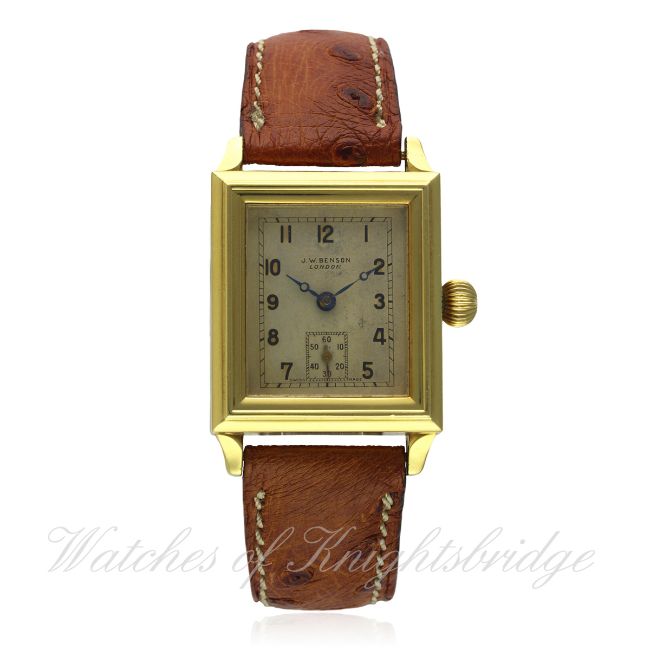 A RARE GENTLEMAN'S 18K SOLID GOLD J.W.BENSON BLITZ WRIST WATCH DATED 1995, REF. 81750 LIMITED EDITION OF 100 PIECES, WITH ORIGINAL BOX & WARRANTY CARD D: An original 1930s dial with applied Arabic numerals, subsidiary seconds, Breguet hands. M: An original 1930s J.W.Benson, manual wind movement. C: Rectangular case, signed J.W.Benson Blitz, hallmarked & numbered, original crown, case measures approx. 30mm by 27mm. S: Brown leather strap. CONDITION REPORT D: Original dial in excellent condition. M: Working at present. C: In excellent condition, with some light scratches due to general use. S: In good condition. D: Dial / M: Movement / C: Case / S: Strap / B: Bracelet