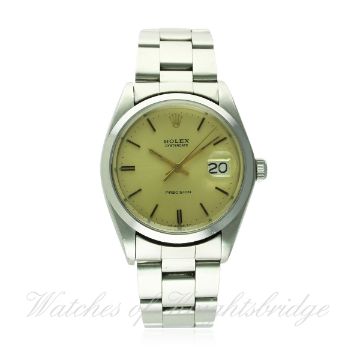 A GENTLEMAN'S STAINLESS STEEL ROLEX OYSTERDATE BRACELET WATCH CIRCA 1970, REF. 6694 D: Champagne dial with gilt batons & hands, date aperture. M: 17 jewel manual wind movement, signed Montres Rolex S.A., calibre 1225. C: Oyster case, signed Montres Rolex S.A., dated IV.70, numbered, Rolex crown, case diameter measures approx. 35mm. B: Rolex Oyster bracelet, numbered H/78350/19/557. CONDITION REPORT D: Original dial in excellent condition. M: Working at present. C: In very good condition, with some small scratches due to general use. B: In excellent condition, with light scratches. D: Dial / M: Movement / C: Case / S: Strap / B: Bracelet