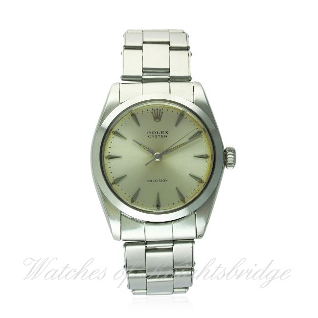 A GENTLEMAN'S STAINLESS STEEL ROLEX OYSTER PRECISION BRACELET WATCH CIRCA 1966, REF. 6426 D: Silver dial with silver "dagger" batons & hands. M: 17 jewel manual wind movement, signed Montres Rolex S.A. & numbered, calibre 1215. C: Oyster case, signed Montres Rolex S.A., dated II.66, numbered, Rolex crown, case diameter measures approx. 35mm. B: Original Rolex Oyster riveted bracelet, numbered 7205/60 & dated 3/66. CONDITION REPORT D: Original dial in excellent condition, showing some small signs of age around the edge. M: Working at present. C: In excellent condition, with some light scratches due to general use. B: In very good condition. D: Dial / M: Movement / C: Case / S: Strap / B: Bracelet
