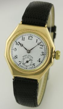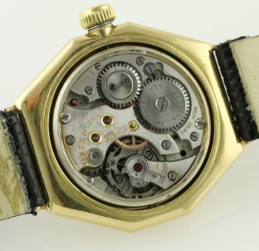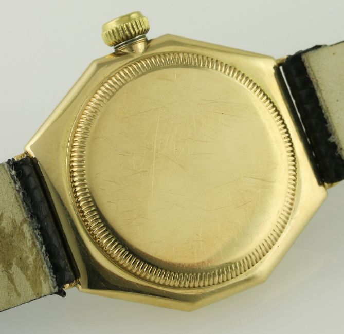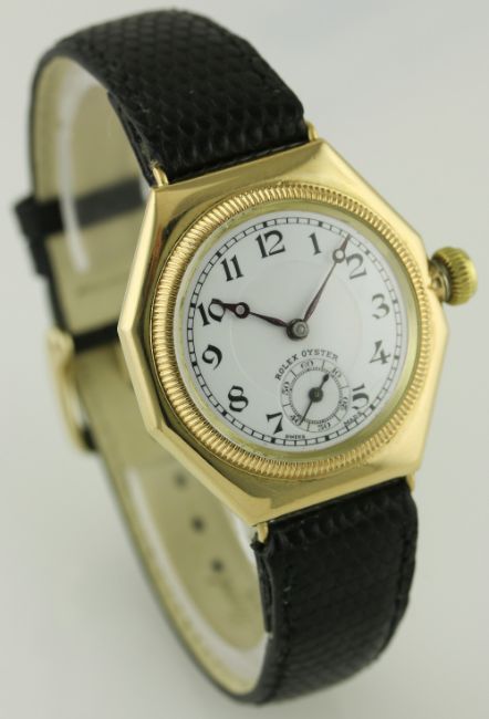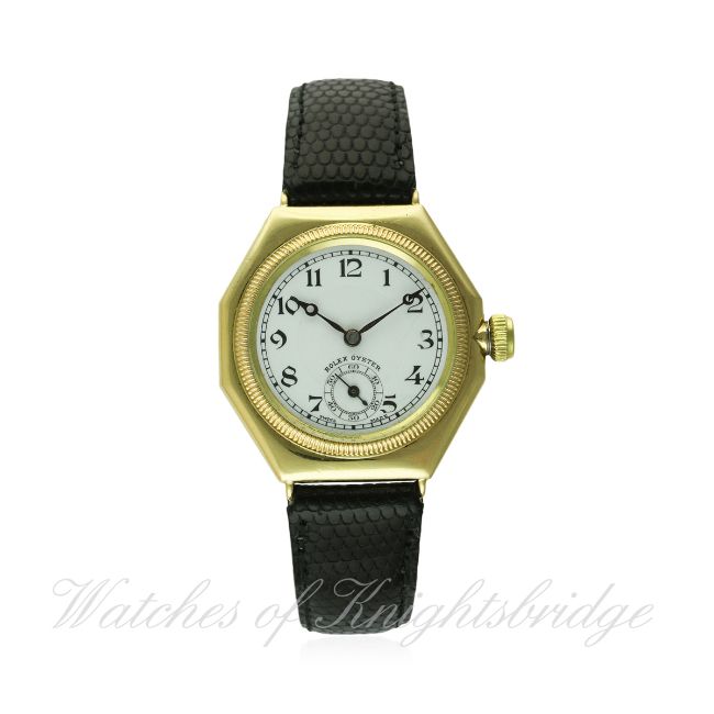 A RARE GENTLEMAN'S 18K SOLID GOLD ROLEX OYSTER OCTAGONAL WRIST WATCH CIRCA 1920s D: White enamel dial with Arabic numerals, subsidiary seconds, Breguet hands. M: 17 jewel manual wind movement signed Rolex . C: Octagonal shaped Oyster case with milled screw back & front, signed Oyster Watch Co, R.W.C. Ltd, hallmarked & numbered, Oyster Patent crown, case width measures approx. 32mm. S: Black leather strap. CONDITION REPORT D: Original dial in very good condition. M: Working at present. C: In excellent condition, some light surface scratches due to general use. S: New D: Dial / M: Movement / C: Case / S: Strap / B: Bracelet.