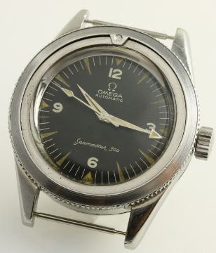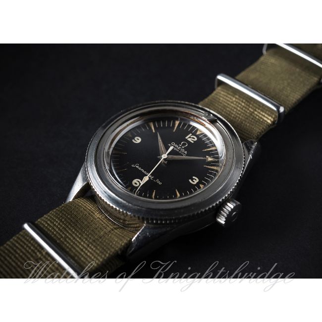 A RARE GENTLEMAN'S STAINLESS STEEL OMEGA SEAMASTER 300 AUTOMATIC WRIST WATCH CIRCA 1962 REF. 165.014-62 D: Black dial with luminous markers, quarterly Arabic numerals, steel small arrow minute hand & alpha hour hand. M: 24 jewel automatic movement, signed Omega Watch Co. & numbered, calibre 552. C: Circular case with rotating bezel missing the enameled insert, signed Omega Watch Co., Seamaster emblem on case back, Omega crown, case diameter measures approx. 39mm. S: NATO strap. CONDITION REPORT D: Original dial in excellent condition. M: Working at present. C: In very good condition. S: In excellent condition. D: Dial / M: Movement / C: Case / S: Strap / B: Bracelet